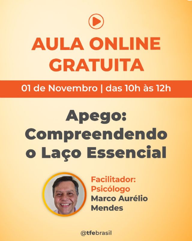 No próximo dia 01/11, teremos mais uma aula gratuita aqui no TFE Brasil. Nosso diretor Marco Aurélio Mendes, irá falar sobre a Teoria do Apego, seu objeto de estudo há quase 20 anos, e descrever como estas experiências iniciais marcam as nossas emoções. Marco irá falar também do apego ao longo da vida e descrever intervenções psicoterapêuticas com base na sua leitura particular da Teoria a partir do paraddigma experiencial presente na Terapia Focada nas Emoções. Você receberá uma confirmação no seu email. Fique atenta para não digitar seu email errado ok? O link será enviado na semana do evento. A aula não dará direito à certificado. Pedimos que fiquem com as câmeras abertas para que possamos interagir com você. Estamos te aguardando. Adoraríamos que convidasse colegas interessados. Falaremos também do nosso workshop A Clínica do Apego, que acontecerá em Janeiro e Fevereiro. Data: 01/11/2025 Horário: 10 às 12 horas Local: Casa virtual do TFE Brasil (Zoom) |